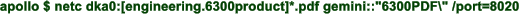 apollo $ netc dka0:[engineering.6300product]*.pdf gemini::"6300PDF\" /port=8020